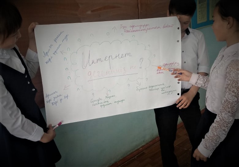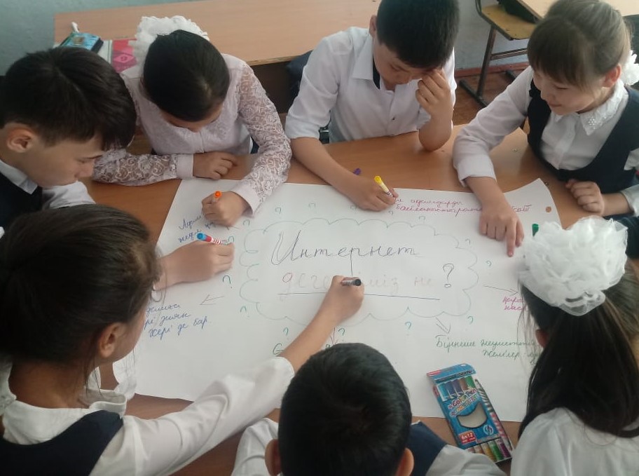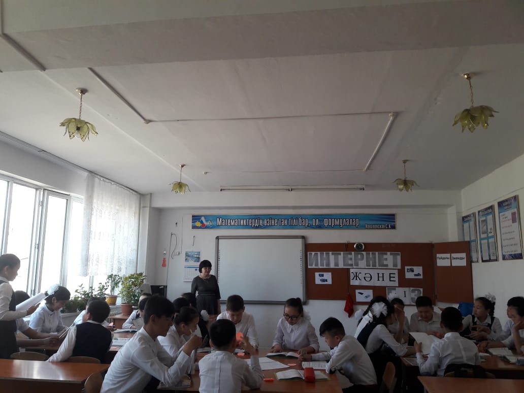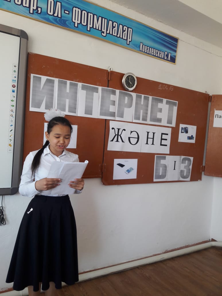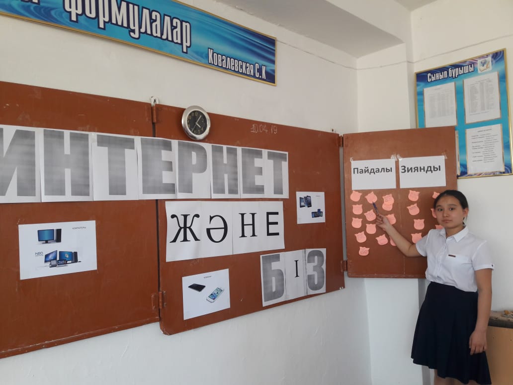 Сынып сағатында оқушыларға интернетті дұрыс пайдалану жолдары туралы түсінік берді. Интернет желісіндегі әр түрлі сайттарды туралы айтылып олардың пайдалы және зияны туралы оқушылар топ – топ болып плакат жасап қорғады09.04 күні 7 «д» сыныбында «Интернет және біз» атты ашық сабақпен жалғасын табуда. Ашық сабақта оқушылар интернеттің пайдасы мен зияның талқылап пікір алмасты. Оқушылар реферат қорғап сабақтың тақырыбын аша білді. Ашық сабақ өз мақсатына жетті.