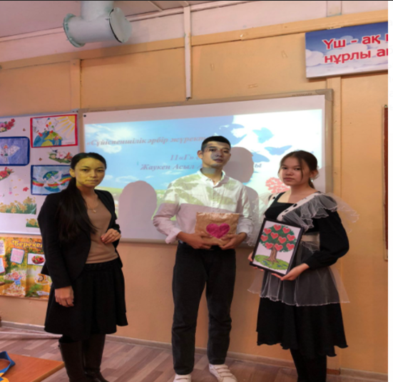 Атырау облысы Жылыой ауданы Құлсары қаласы N18 М.Сатыбалдиев атындағы жалпы орта білім беретін мектепте 2021жылдың 23қараша күні “Жалпыадамзаттық құндылықтар”күні аясында 11”Г” сыныбына “Сүйіспеншілік-әрбір жүректе” атты ашық сабақ өтті.Оқушылар жалпыадамзаттық құндылықтар туралы түсініктерін- сүйіспеншілік құндылығы арқылы мәнін ашты. Сабақ соңында “Жүрек қуанышы” атты оқушылардың шығармашылық жұмыстарының көрмесі ұйымдастырылды!