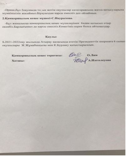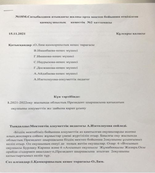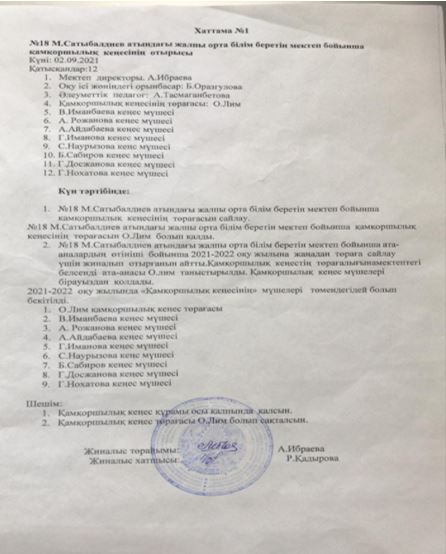 №18М.Сатыбалдиев атындағы жалпы орта білім беретін мектеп бойынша өткізілген қамқоршылық кеңестің №1, №2 хаттамасы
